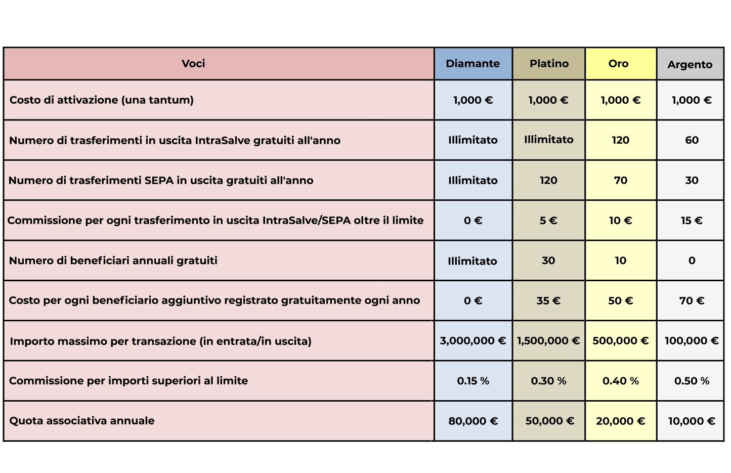 Tutte le imprese che desiderano aprire un conto di pagamento con Salve sono classificate in quattro livelli di adesione distinti, ciascuno su misura per la natura delle vostre attività commerciali. Ogni livello offre una serie di vantaggi esclusivi pensati per soddisfare le vostre esigenze specifiche. Di seguito potete scoprire i servizi, le commissioni e le tariffe associati a ciascun livello di adesione. Le commissioni e le spese applicabili a ciascun servizio fornito dal PSP sono determinate in base al livello di adesione selezionato dal Cliente. Tali commissioni e spese rimarranno valide per l'intero periodo di adesione di dodici (12) mesi.